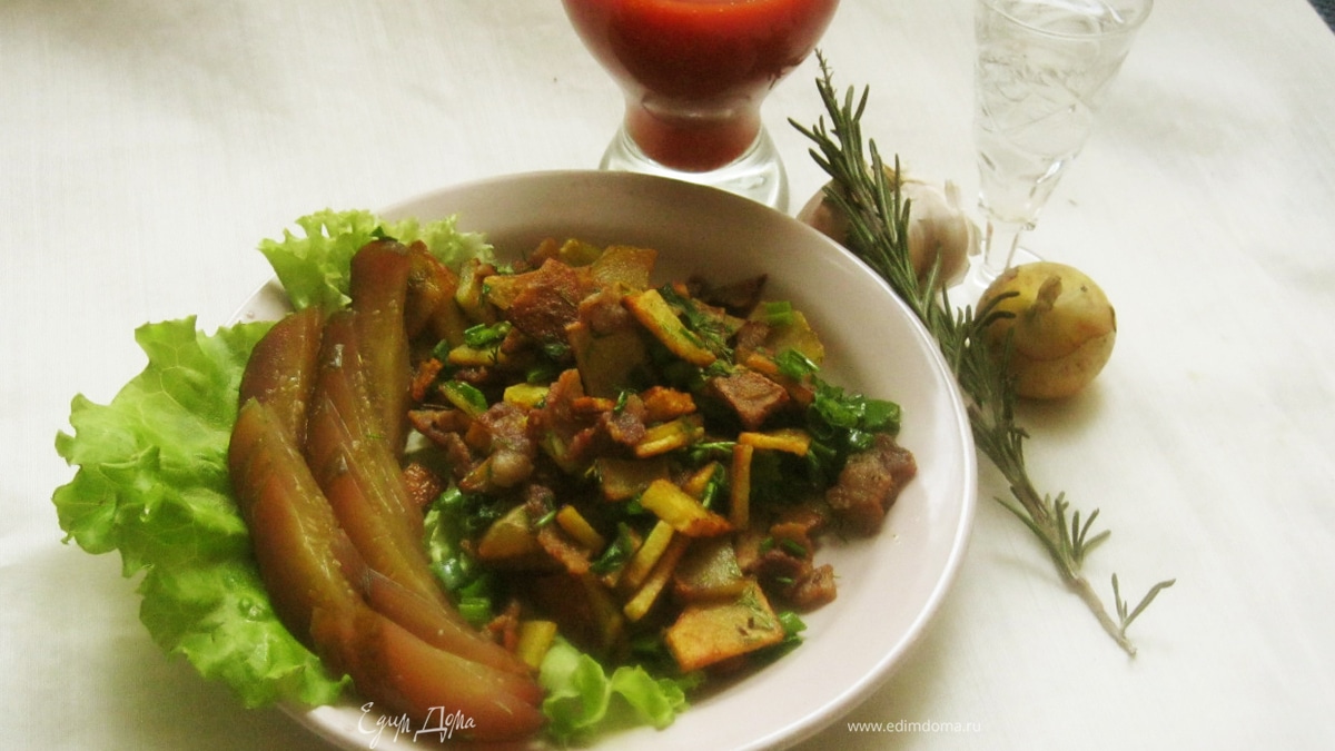 На оставшемся в сковородке сале, поджарил две картофелины. Способ нарезки и степень прожарки исключительно дело вашего вкуса. Готовую картошку снял с огня, смешал с беконом и рубленым зеленым луком и зеленью. Выложил в тарелку, а рядом положил домашний огурчик пряного посола. - Шаг 4