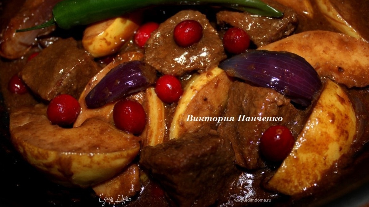 Сытное вкусное мясное блюдо с густым ароматным соусом и пикантным фруктово-ягодным привкусом...