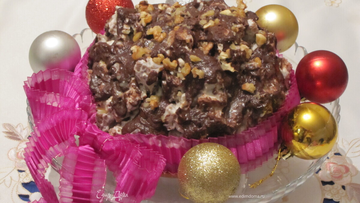 Выложить кубики с кремом на нижний корж и придать форму горки. Полить шоколадной глазурью.
