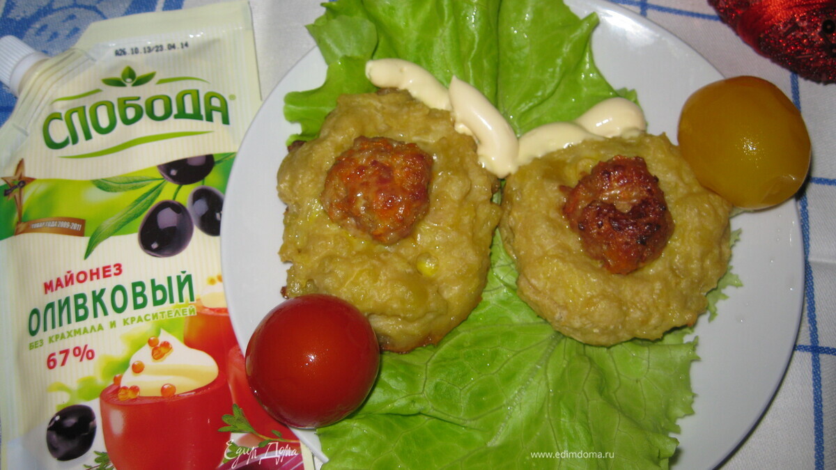 Руки смазать растительным маслом, из картофеля сформировать лепешки, выложить их на смазанный растительным маслом противень. В каждую лепешку вложить фрикадельку. Чтобы проще было вложить фрикадельку, можно взять чайную ложку, смочите ее в воде и слегка углубить в картофель. Выложить туда фрикадельки. Смазать гнездышки взбитым яйцом. Поставьте в разогретую до 200 С духовку на 15-20 минут. Подавать на листьях салата с майонезом .
