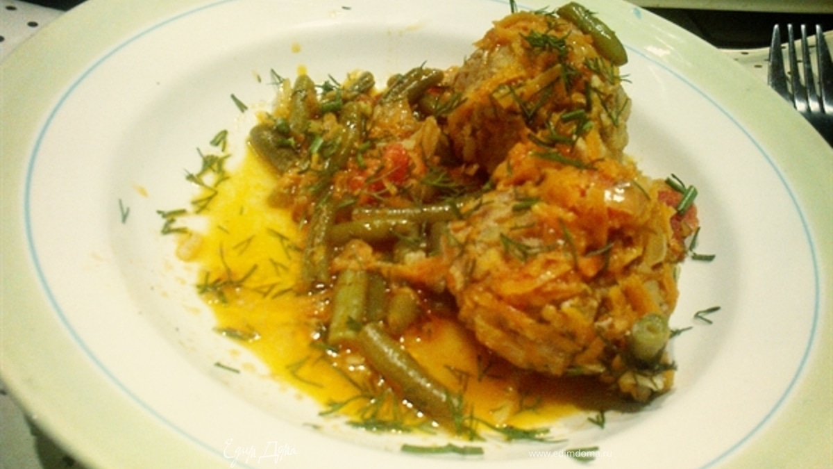На дно глубокой кастрюли выкладываем небольшую часть капусты (ну или как в моем экспериментальном случае - стручковой фасоли). Влажными руками лепим из фарша тефтели, у меня они большие, около 10 см в диаметре) так уж у нас повелось :) Выкладываем тефтели в кастрюлю слоями, засыпая в промежутки нашинкованную капусту. Далее на дно кастрюли необходимо вылить 1 стакан любого рассола и поставить на слабый огонь, тушиться около 30 минут) - Шаг 4Тем временем необходимо заняться соусом. Мелко нашинкованный лук обжарить на растительном масле, добавить натертую морковь. Следующие на очереди - помидоры. В зависимости от сезона - свежие или маринованные. Ну как по мне - так с маринованными вкуснее. То есть ~ 4 маринованных помидора очистить от кожицы, размять вилкой и добавить к уже обжаренным луку и моркови. Тушить минутку, после чего добавить пару ложек сметаны, соль, перец, зелень по вкусу и оставить на медленном огне еще минут пять. Необходимо помнить и быть внимательным с добавлением соли, так как используем рассол и маринованные помидоры. Есть опасность пересолить и всё испортить.