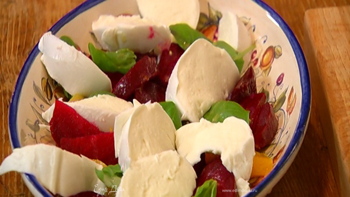 Выложить в блюдо апельсиновую мякоть, дольки свеклы, посыпать салат листьями базилика, полить заправкой, а сверху разложить моцареллу. Оставшуюся заправку подать к салату в отдельной посуде.