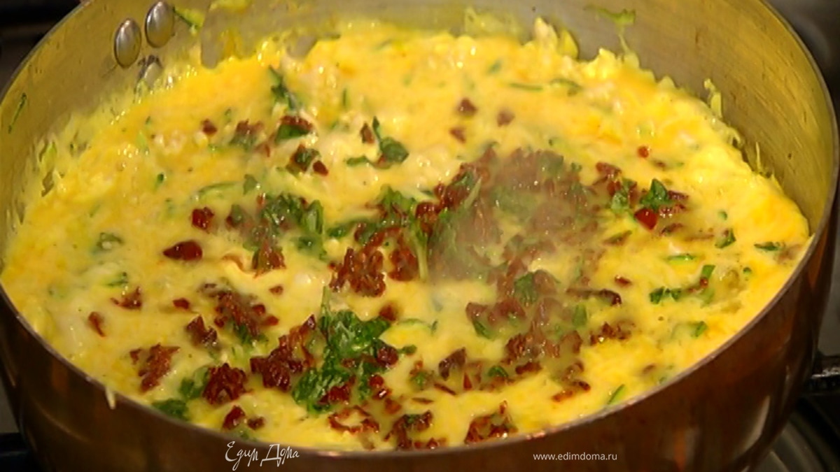 За несколько минут до готовности посыпать фриттату измельченными помидорами и базиликом.