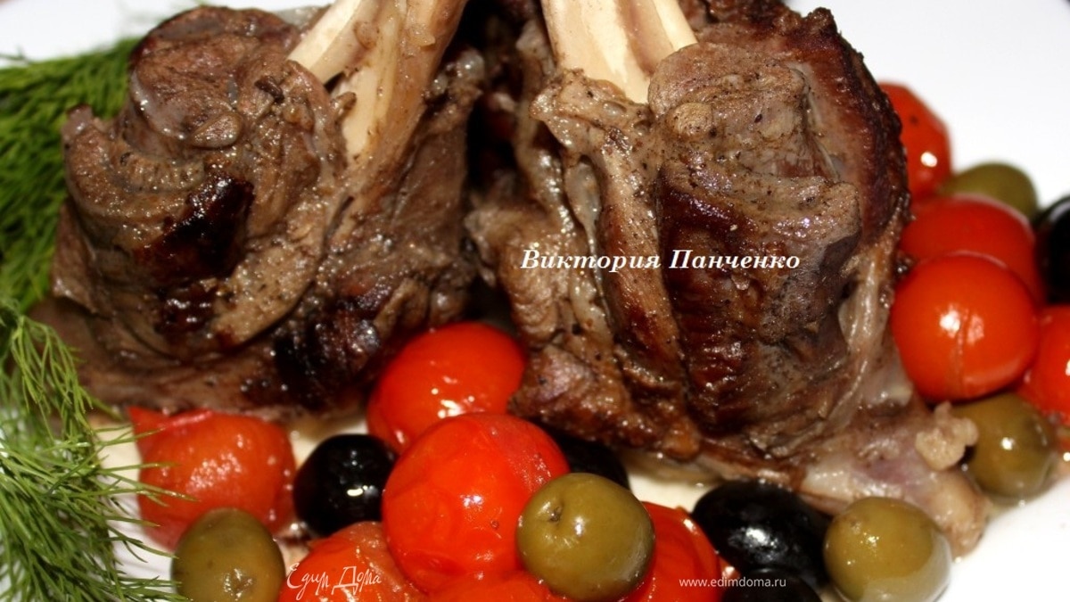 Налить в чашу 550-600 мл воды. Мясо должно быть полностью закрытым. Немного посолить и готовить на режиме ТУШЕНИЕ 1 час. Если за это время мясо не станет мягким, тушить еще минут 20-25 на этом же режиме. Затем добавить оливки и маслины, переключить мультиварку на режим ВЫПЕЧКА и готовить еще 30 минут. За 15 минут до окончания режима добавить в чашу помидоры-черри.