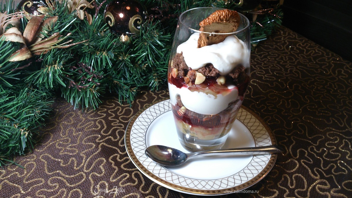 Это не ошибка в названии рецепта. Перед вами действительно датский яблочный пирог!!!))) Я точно так же была удивлена, когда увидела его рецепт в одной телепередаче. Для него я и испекла орехово-шоколадное печенье. В оригинале испльзуется миндальное печенье, которое я и собиралась испечь. Но когда увидела рецепт такого ароматного печенья с грецкими орехами, то поняла, что именно оно будет великолепно сочетаться с остальными ингридиентами. Очень рекомендую этот десерт тем, у кого нет времени на долгую выпечку к Новому году. Все ингридиенты можно приготовить заранее и все собрать в последний момент. К тому же и гостей можно удивить.))