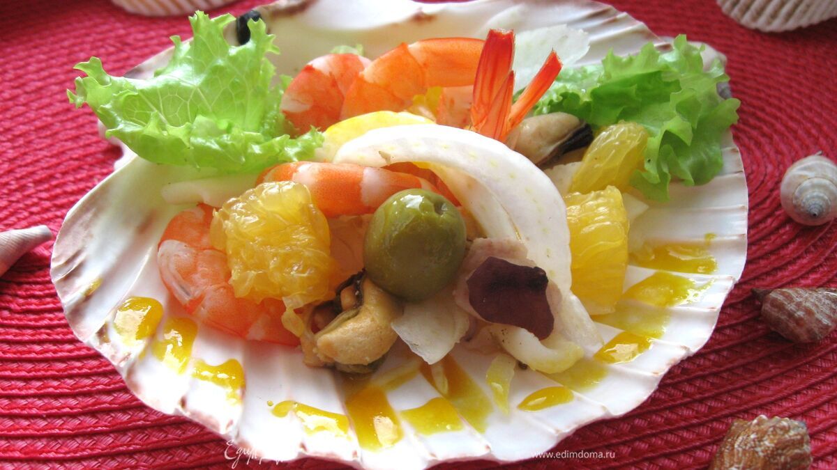 Этот салат напоминает о лете, теплом, солнечном, ярком и вполне подойдет для новогодней вечеринки в морском стиле, его можно приготовить и просто так для любимого человека, если хотите порадовать его утонченной элегантностью блюда. Зелень может быть добавлена любая, но я бы предпочла максимально нейтральную по вкусу. К апельсину можно добавить несколько долек красного грейпфрута. Факультативно: каперсы, чуть-чуть сухого розмарина и, конечно же, бокал сухого белого вина.