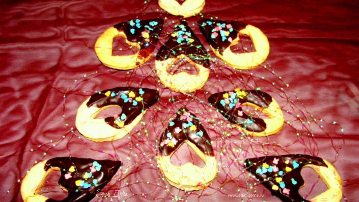 Растопить на водяной бане горький шоколад, обмакнуть печенюшки, посыпать разноцветным украшением или цветным сахаром. Шоколад застывает быстро и надежно, в холод убирать печенюшки нет нужды. - Шаг 2