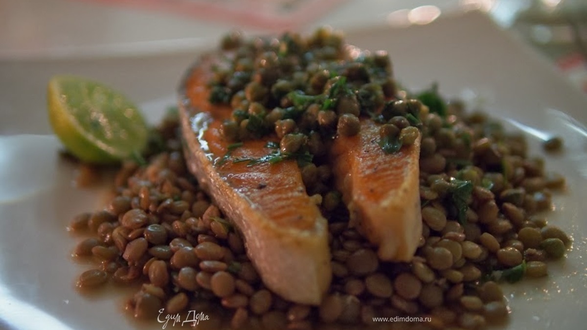 Подача - выкладываем на тарелку чечевицу, затем лосось и поливаем соусом. Рекомендуется к блюду белое сухое вино типа Pinot Grigio. Приятного аппетита!