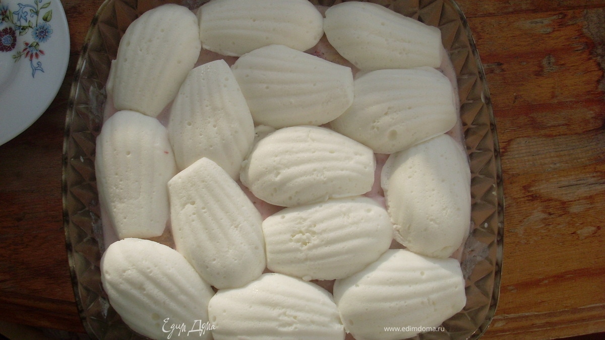 Складываю с салатник (можно конечно и в форме для торта это сделать) половину бисквитов, на них половину клубничного крема, сверху второй слой печенья и снова крем. Сверху украшения - облака из молока. - Шаг 4