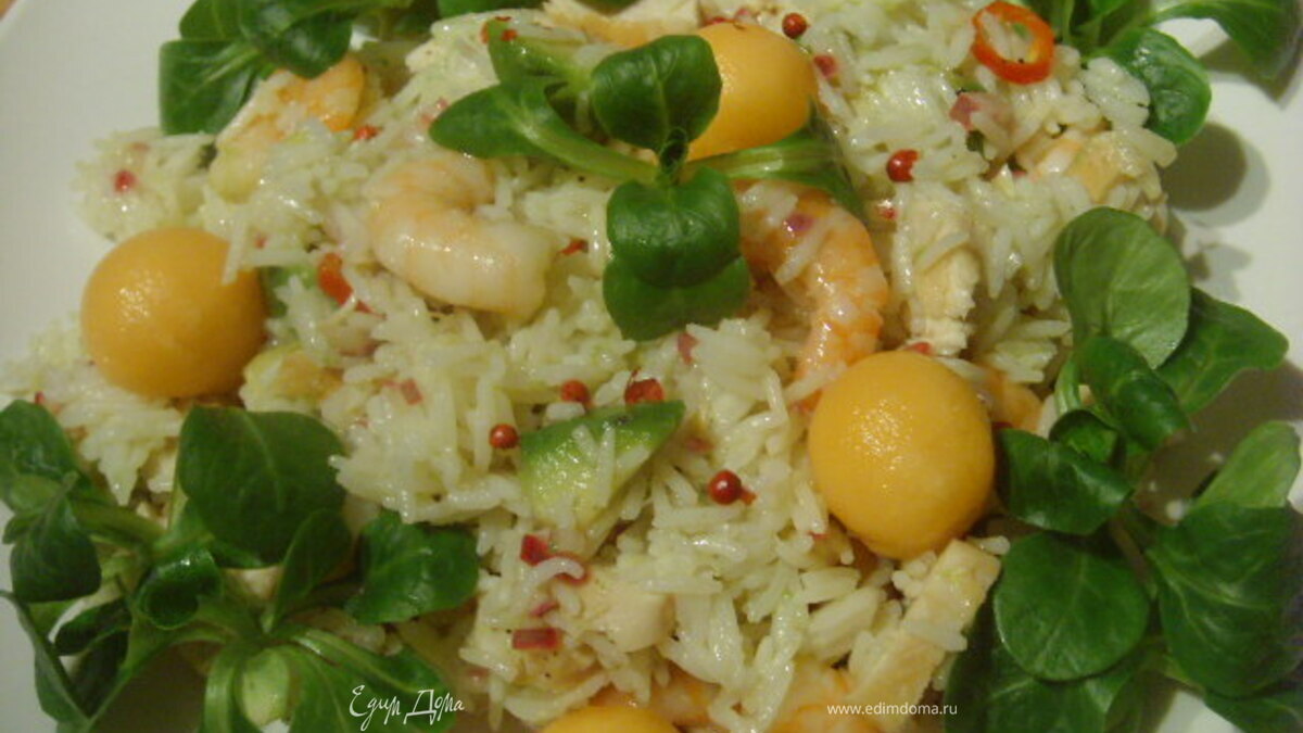 Теперь пришло время соединить все подготовленные ингридиенты с рисом и поставить на некоторое время салат настаиваться. Для сервировки предлогаю украсить зелёным салатом кресс и шариками из мякоти дыни, а так же ягодками красного перца. Приятного аппетита!