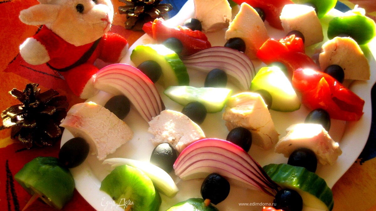 Теперь берём шпажки и чередуем на них кусочки по своему усмотрению.
