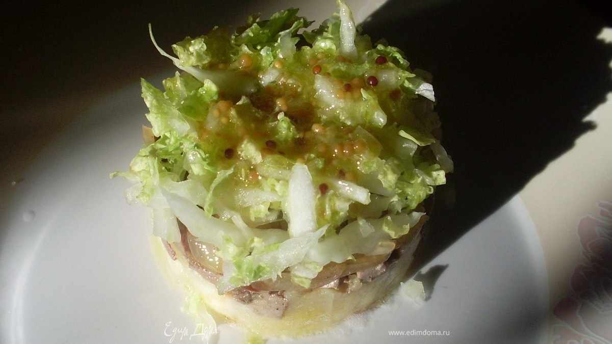 Сверху выложить слой карамельного лука (его прижать ложкой, т.к. к прессу он липнет). Насыпать пекинской капусты. Сверху полить заправкой, аккуратно снять кольцо и подавать.