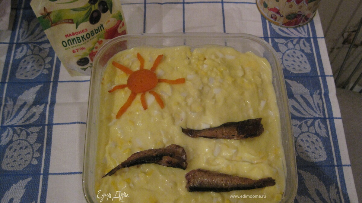Сверху намазываем оливковый майонез "Слобода". Украшем шпротами-рыбками и из вареной морковки делаем солнышко. Приятного аппетита!