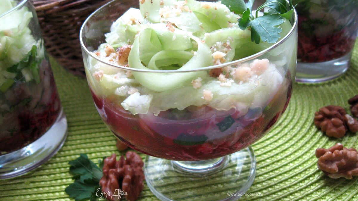 Верхний слой - яблочно-огуречный. Украсить орехами и листиком петрушки. Поставить охлаждаться на 1- 2 часа в холодильник.