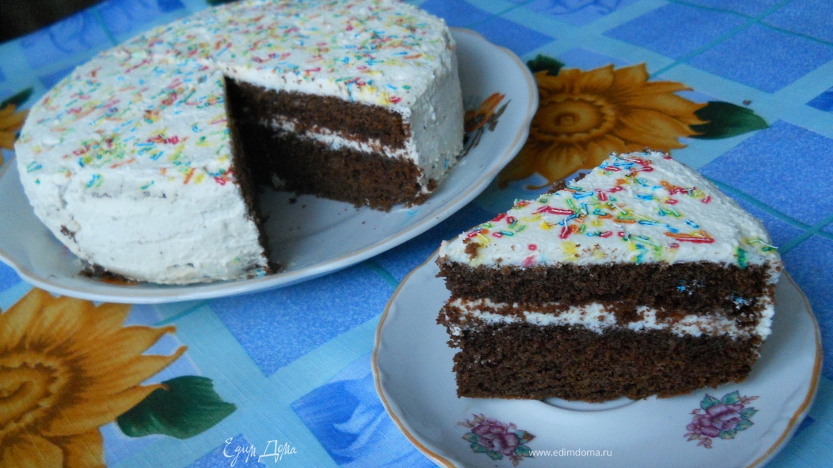 - Шаг 4Сборка. Разрезанные коржи я промазала вареньем клубничным, для пропитки. Коржи промазать кремом, бока тоже покрыть кремом. P.S. Готовый испечённый корж можно разрезать на три части, но тогда крема понадобится больше. Верх торта можно покрыть глазурью шоколадной. Торт очень вкусный!!!!!