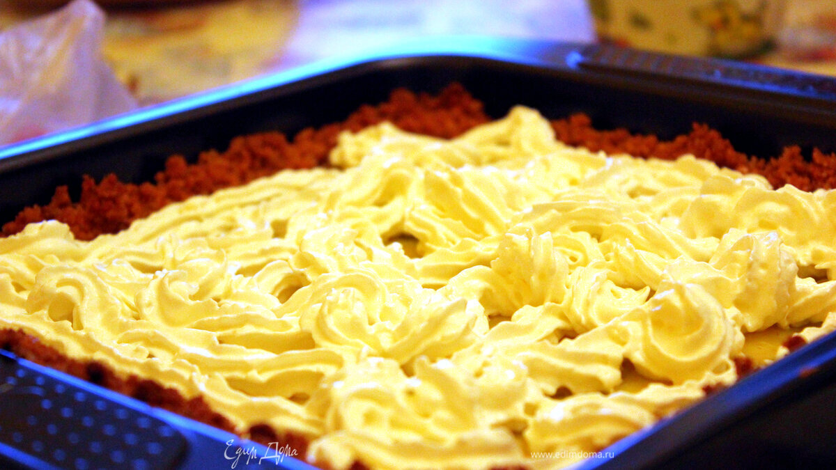 - Шаг 5Готовый пирог поставить на ночь в холодильник (или как минимум на 4 часа). На утро украсить взбитыми сливками.