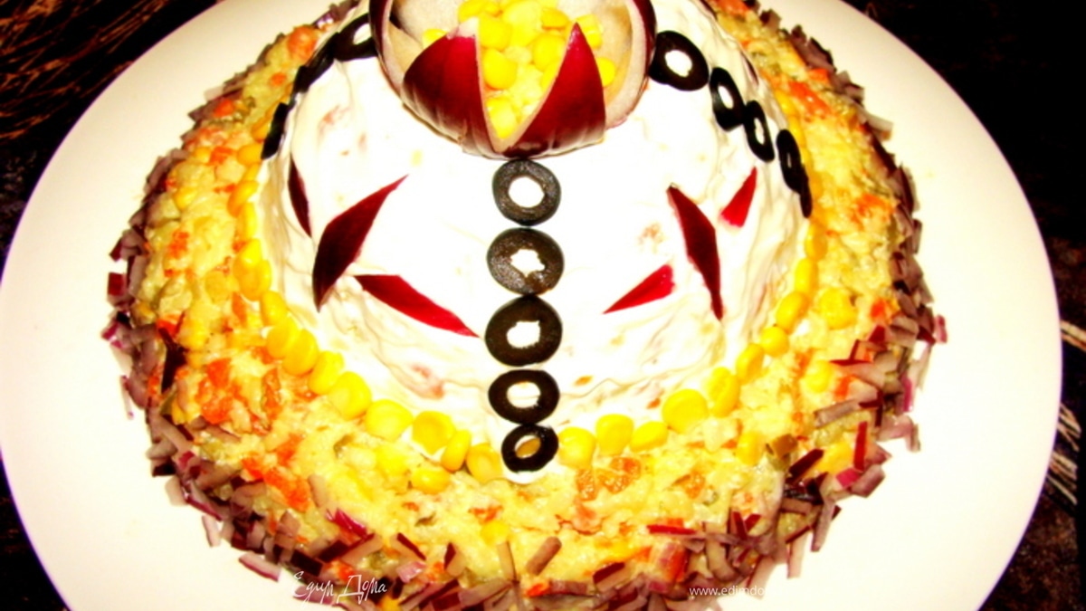 Я использовала кусочки лука, черные маслины и кукурузу. Видела гораздо более сложные рисунки из сладкого перца (царскую символику), горошек, кучу мелких деталей, но я люблю минимализм. Мой вариант получился спонтанный, т.к. на составляющее салата в предлагаемом рецепте я вовсе внимания не обратила... А украшение данного варианта, вытекло именно из ингредиентов входящих в состав. - Шаг 4