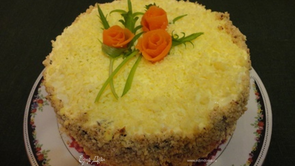 Кольцо от разъемной формы диаметром 18-19 см уложить на блюдо и выложить с него все ингредиенты слоями, смазывая каждый майонезом, в следующей последовательности: свекла, яблоки, картофель, соленые огурцы, морковь, чернослив. Яичные белки натереть на крупной терке и выложить на чернослив. Верх и бока смазать майонезом и верх торта посыпать натертыми на мелкой терке яичными желтками. Бока украсить рублеными орехами, а верх цветами из овощей, входящих в состав салата. - Шаг 3
