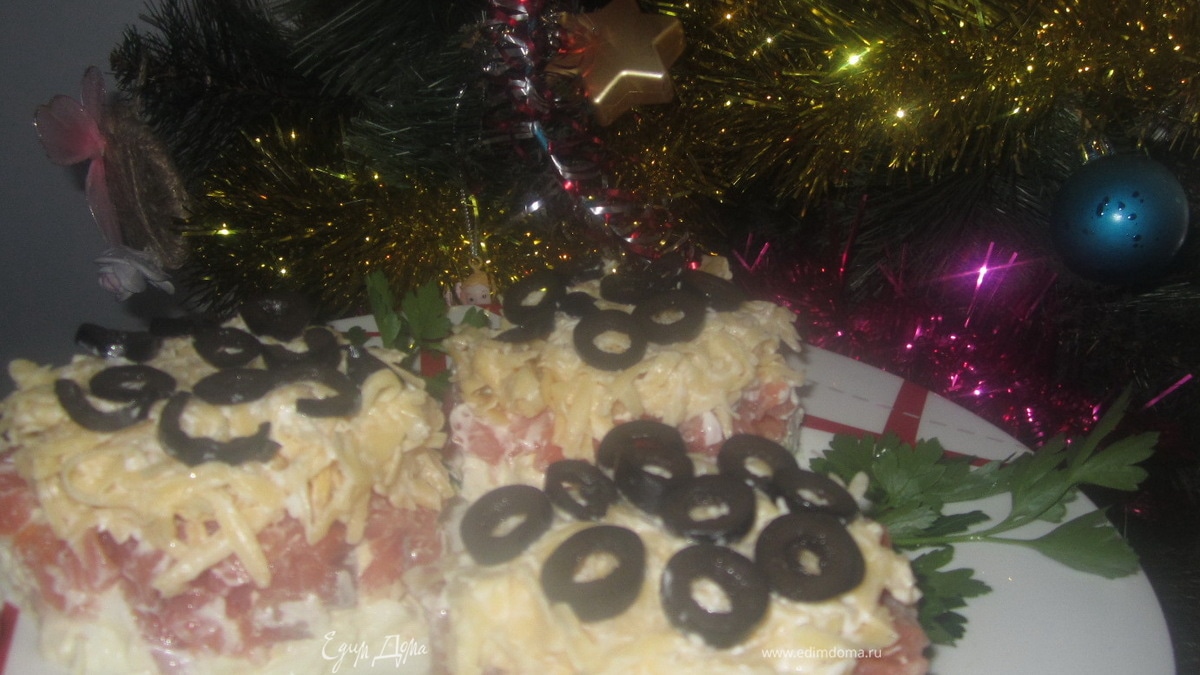 Сверху- нарезанные кольцами маслины. Украсить веточками зелени укропа или петрушки. Салат можно не солить.