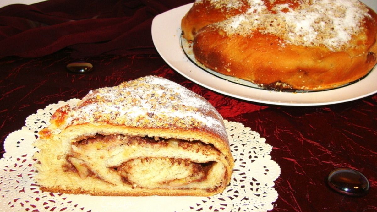 Свернуть рулет в форме улитки и уложить в форму. Чтобы пирог получился пышнее, я разогреваю духовку до 220*, ставлю пирог и убавляю температуру до 100*, даю пирогу подняться минут 15, потом увеличиваю температуру до 160 и выпекаю еще минут 30. Готовность можно проверить деревянной палочкой. За 10 минут до готовности можно смазать желтком и посыпать орешками. Второй пирог, я еще и сахарной пудрой посыпала. - Шаг 5