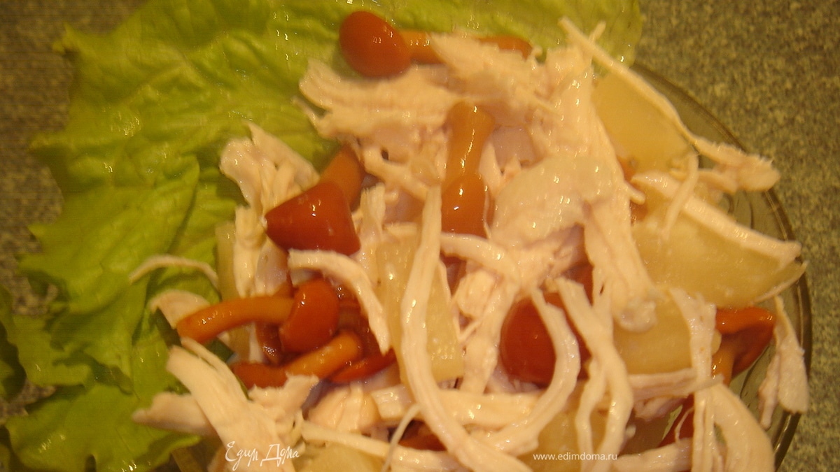 - ПодготовкаОтварить филе в подсоленной воде. остудить, разделить на волокна. Грибы откинуть на сито и дать стечь жидкости. Ананас нарезать тонкой соломкой или маленькими кубиками. Перемешать с грибами и курицей. Для соуса смешать йогурт и вино, приправить солью и перцем. Креманку или широкий бокал выложить листьями салата, уложить курицу с грибами и ананасами. Соус подайте отдельно.