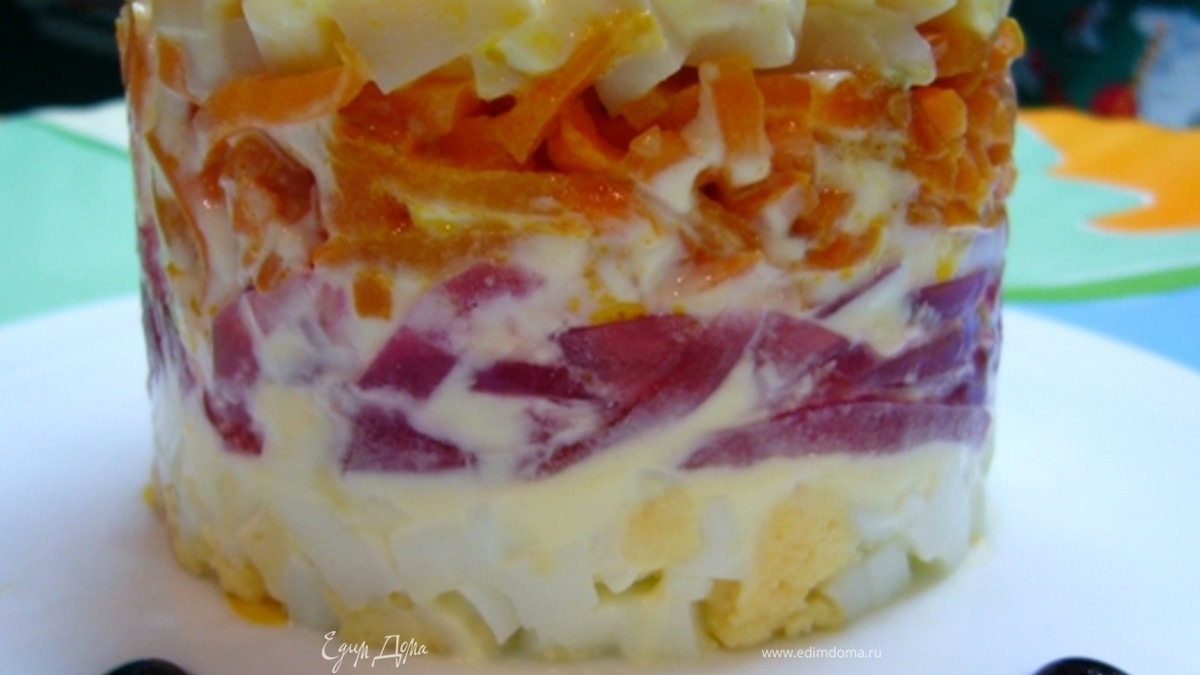Следующий слой – морковь. Майонез. И последний слой – кальмары и майонез. Дать салатику пропитаться. И подавать!