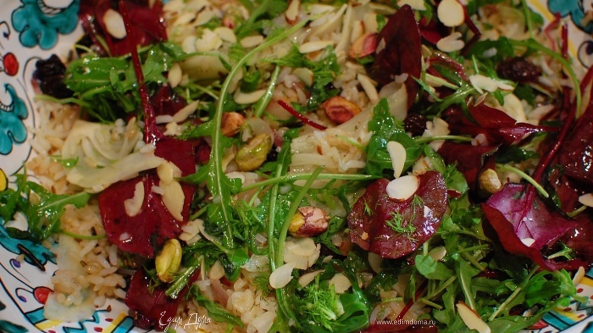 Выложить рис со сковороды на тарелку, добавить салатные листья, посыпать зеленью фенхеля, миндальными хлопьями и фисташками.