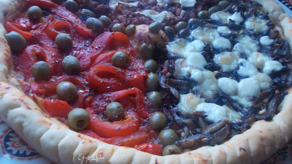 Сподвигла меня на эту пиццу наша Маруся. Как-то она сказала, что есть у неё знакомые, которые не любят мясную пиццу и я подумала,наколько у людей разные вкусы. Есть ведь люди, которые соблюдают пост, или вегетарианцы, а может быть им мясо просто не хочется, что тоже бывает. Вот я и решила,приготовить пицу с тремя разными начинками, мясной, грибной и постной, с перчиком и оливками. Получилась очень яркая и вкусная пицца.
