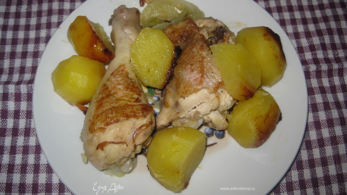 Окорочка выложить на противень. Картофель порезать, выложить на противень, сверху порезанный лук кольцами. Посолить картофель, добавить пряности (перец, лавровый лист) по вкусу. Запекать в разогретой 200-220 град. духовке 30 минут.