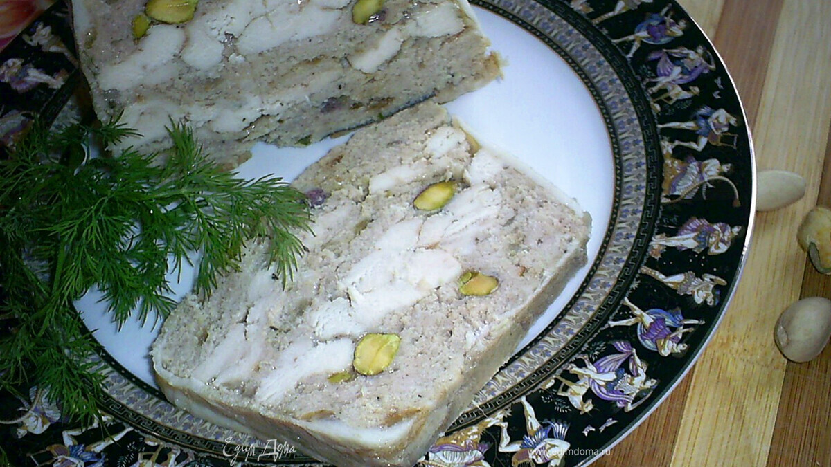Накрываем фарш свисающими кусочками подчеревка. Отправляем в разогретую до 180 градусов духовку на 1,5-2 часа. Если сильно верх начнет румяниться, форму накрыть фольгой. Террин готов, если он отстает от стенок формы, а при его прокалывании вытекает прозрачный сок.