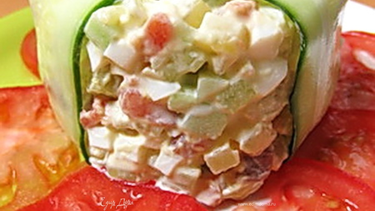 По центру «цветка» установить круглую форму без дна, на бортики которой выложить 3 огуречные полоски (полоски должны быть достаточно длинными, чтобы изнутри они соприкасались на дне формочки, а извне – почти соприкасались с тарелкой). (У меня, например, очень высокая форма, поэтому огурцы не доставали до тарелки. Главное, чтобы они были достаточно длинными, чтобы обвязать ваш салат.) - Шаг 5