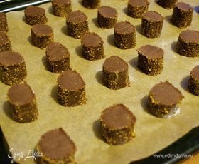 Обвалять в сухой смеси сахара с кофе наши брусочки из теста. После я завернула их в пленку и убрала минут на 25 в холодильник, как раз пока разогревалась духовка.