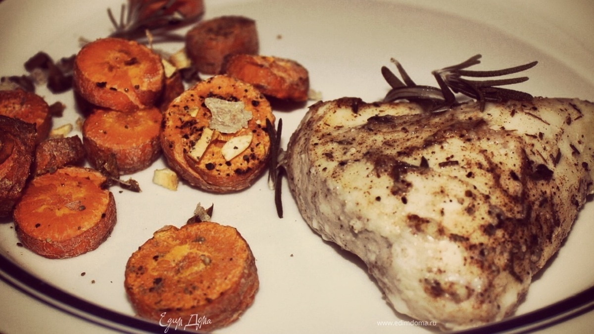 Морковь моем, чистим, если нужно, режем на крупные кругляши. Выкладываем на пекарскую бумагу или противень, смазанный маслом. Сверху посыпаем перцем, солью, кладём листочки свежего розмарина.