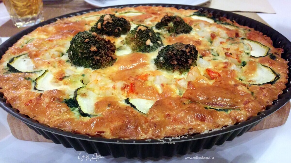 Достаем форму из печки - выкладываем шпинат с луком, брокколи (разломать на соцветия), цукини и креветки.