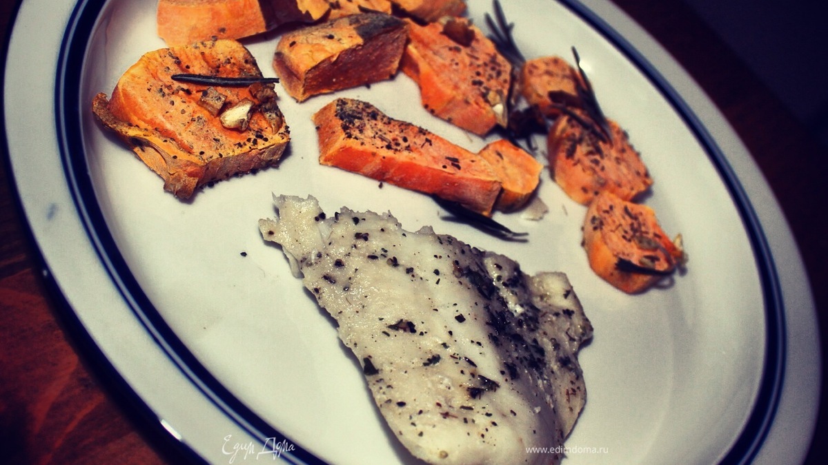 Духовку разогреваем до 200 градусов. Батат выкладываем на пергамент или смазанный маслом противень. - Шаг 3Рыбу в фольге и батат запекаем рядышком 30-35 минут. Готово!