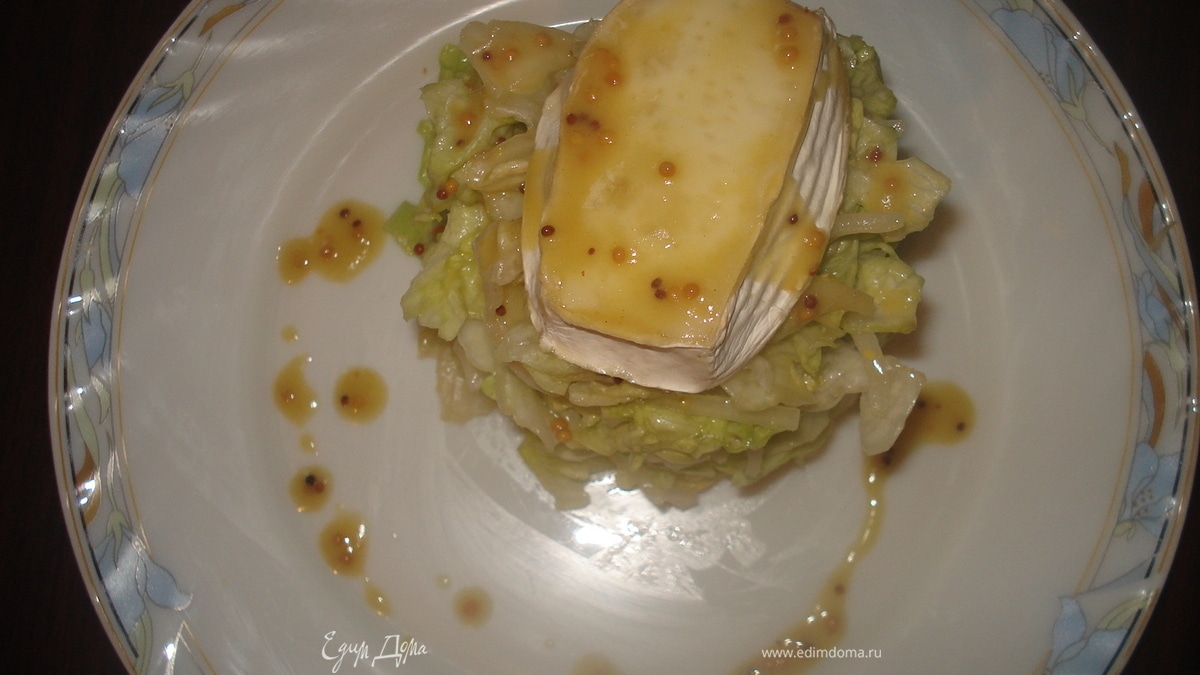 - ПодготовкаЛук порезать полукольцами и замочить в винном уксусе. Айсберг порвать на кусочки среднего размера и добавить каперсы. Сыр бри (или тот мягкий сыр, который у вас есть) порезать на пластины (кружки) высотой ок. 2 см и поместить под гриль на пару минут. Соус: смешать оливковое масло, сок лимона, горчицу и мед - немного взбить. Лук добавить к салату, и заправить салат 3/4 соуса. Выложить на тарелку, сверху положить расплавленный сыр и полить оставшимся соусом.