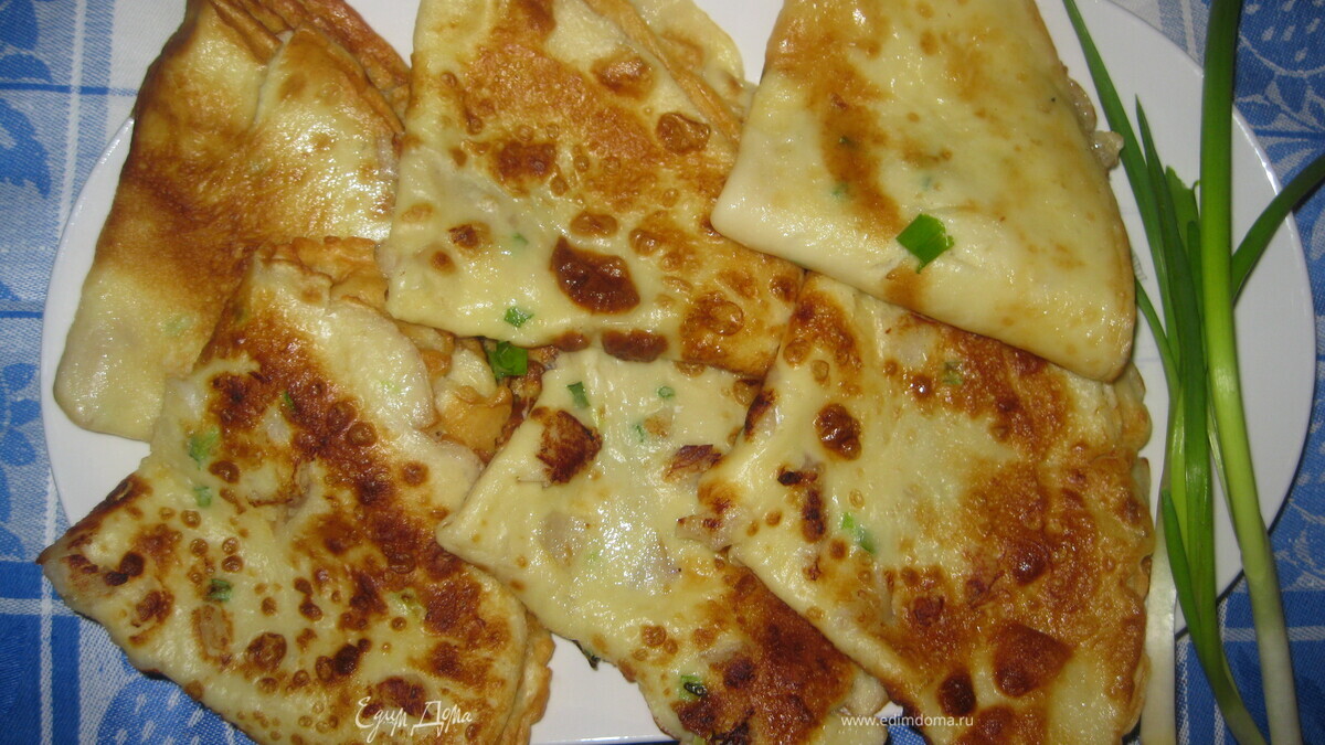 В тесто добавляем вареную рыбу и лук. Перемешиваем. На блинной сковороде выпекаем блины с двух сторон. Складываем на 4 части. Подаем на стол. Приятного аппетита!
