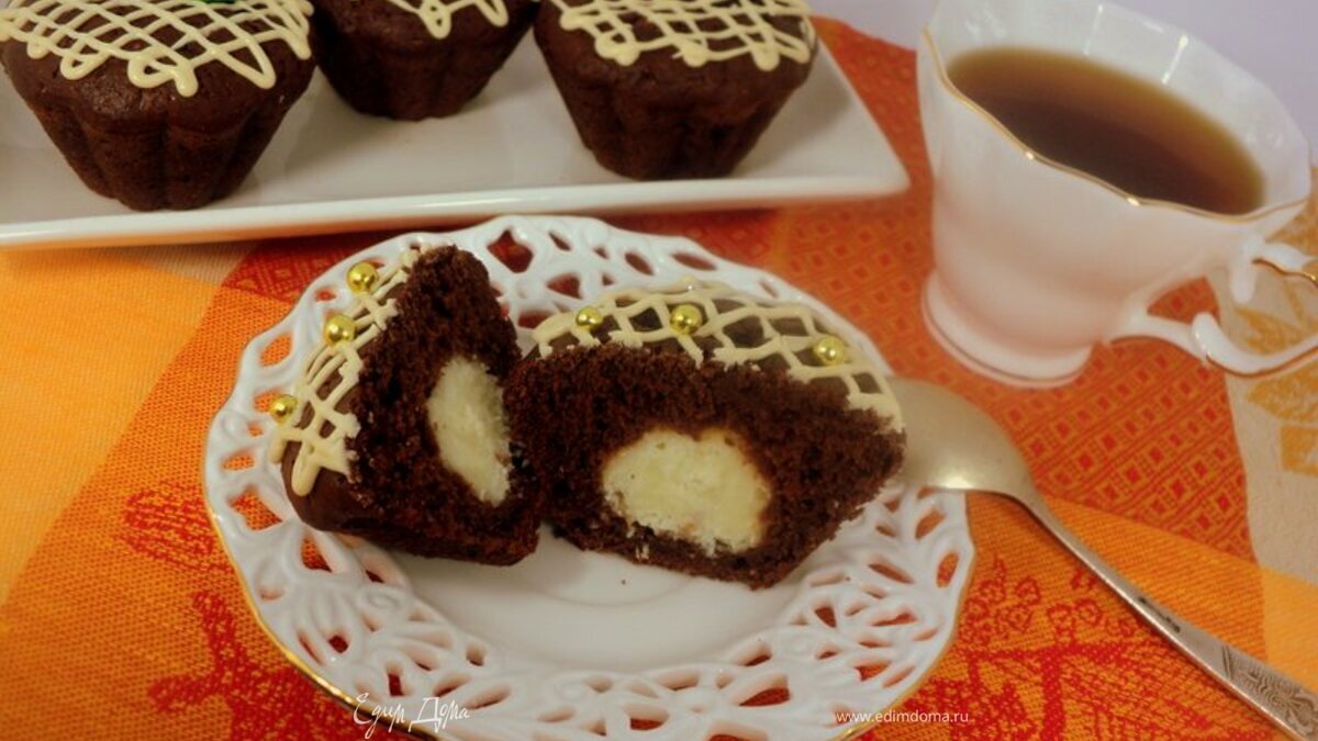 Готовые маффины охладить и украсить сеточкой из белого шоколада. Белый шоколад предварительно растопить вместе со сливками в микроволновке или на водяной бане. Украшать с помощью корнетика из бумаги для выпечки. - Шаг 10