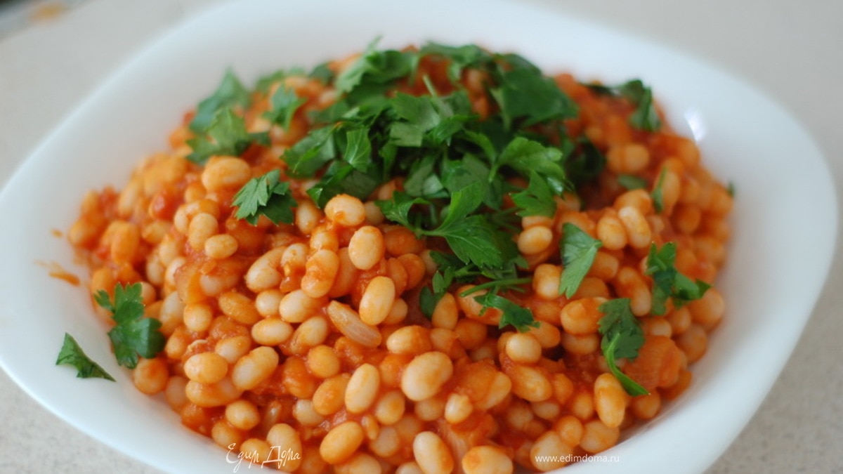 - Шаг 3Смешать томаты и лук с фасолью, выложить в жаропрочную посуду и поставить в духовой шкаф на 15-20 минут