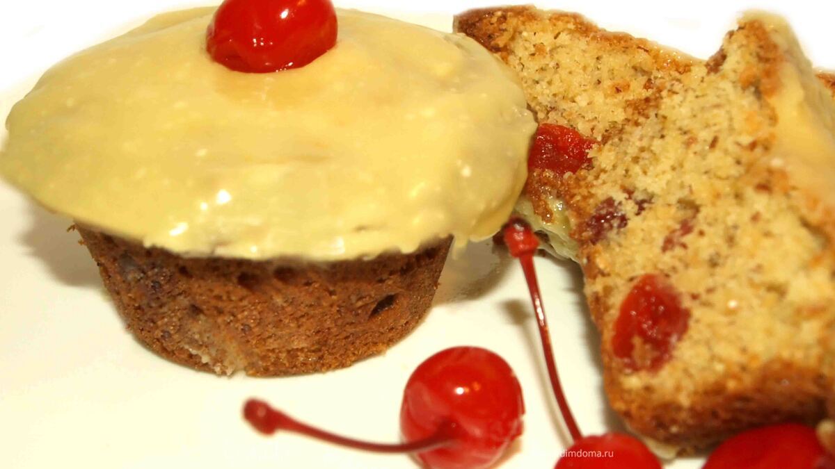 Кексы сверху смазываем ганашем, украшаем коктейльной вишней.