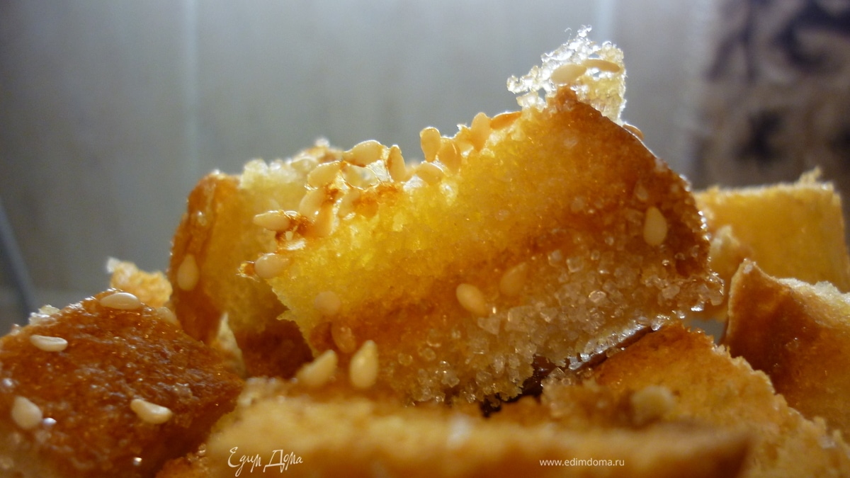 Теперь посыпаем кубики простым и ванильным сахаром и кунжутом. Все ставим в духовку. Для моей хватает 15 минут при 180 градусах. Тут сухарики требуют внимания. - Шаг 2