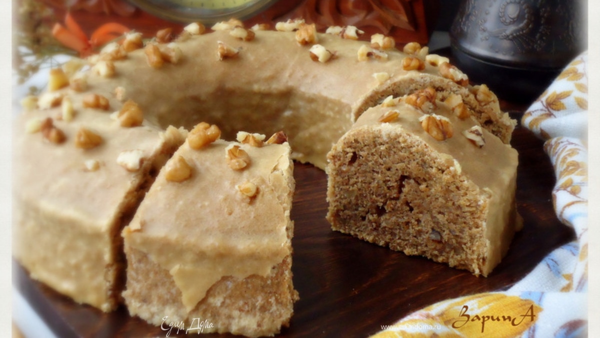 вылить на кекс. Украсить грецким орехом. Дать глазури застыть и можно наслаждаться ароматным кексом. Приятного!!