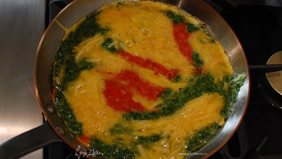 Разогреть в сковороде оставшееся оливковое масло, в центр влить красную омлетную массу, по бокам — зеленую массу, а желтую массу разлить произвольно. - Шаг 11