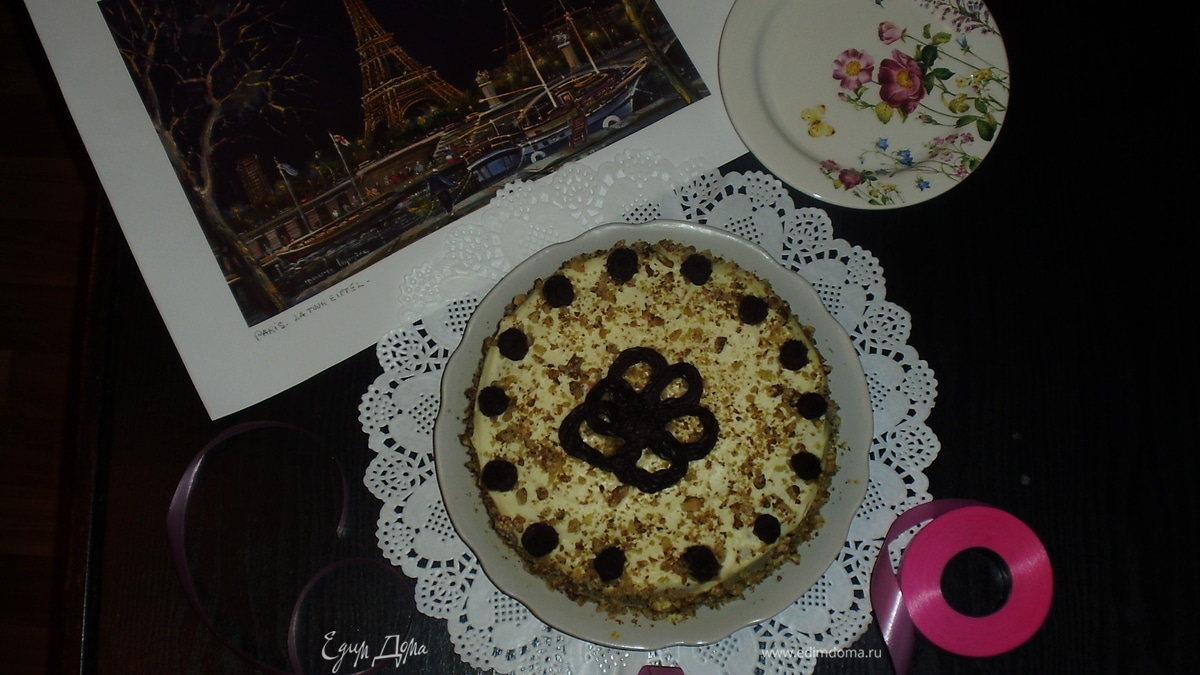 Обмазать кремом, присыпать орехами и украсить.Поставить в холод на ночь для пропитки. P.S. По украшению я не ас, поэтому не судите строго...