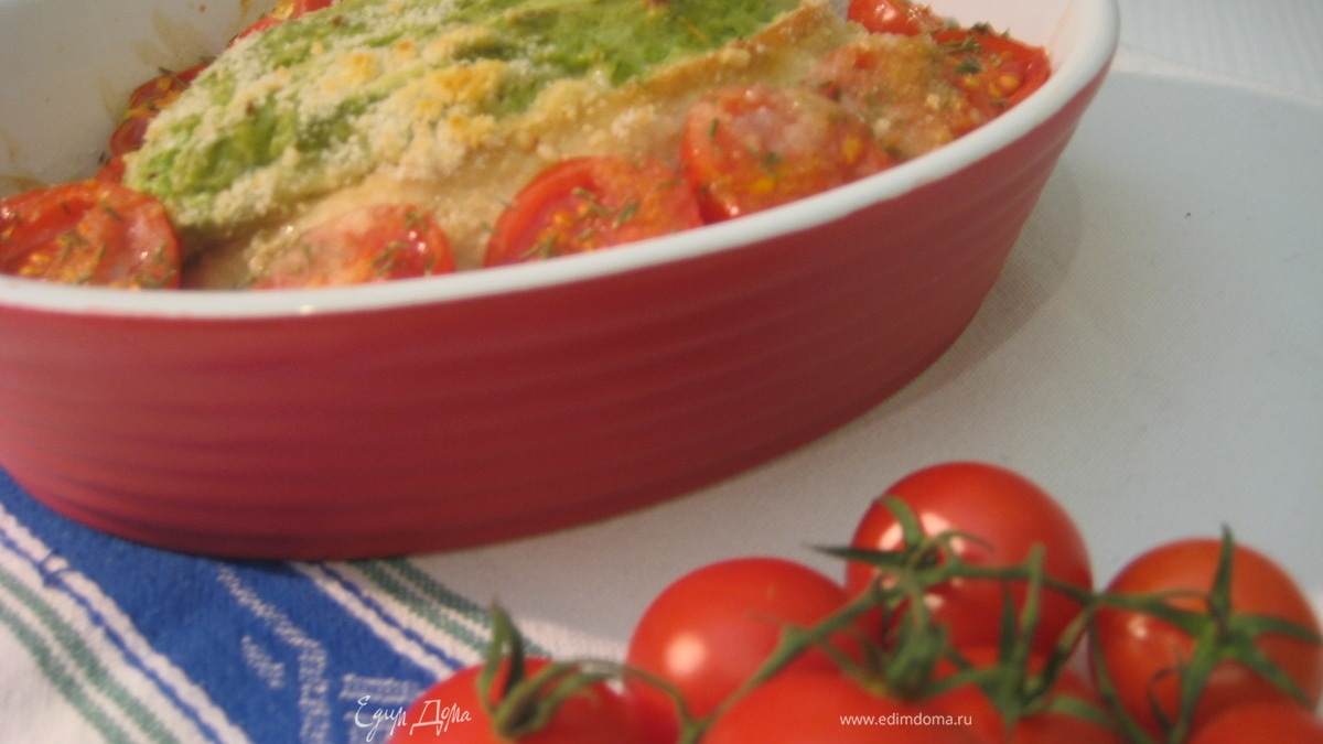 Духовку разогреть до 210 гр.С Приготовить начинку: смешать песто с творожным сыром. Форму смазать оливковым маслом, положить филе вместе с маринадом, влить вино. Зафаршировать начинкой, сбрызнуть оливковым маслом, посыпать сухарями и пармезаном. Помидоры черри разрезать пополам, выложить вокруг филе, сбрызнуть оливковым маслом, посолить, посыпать орегано.