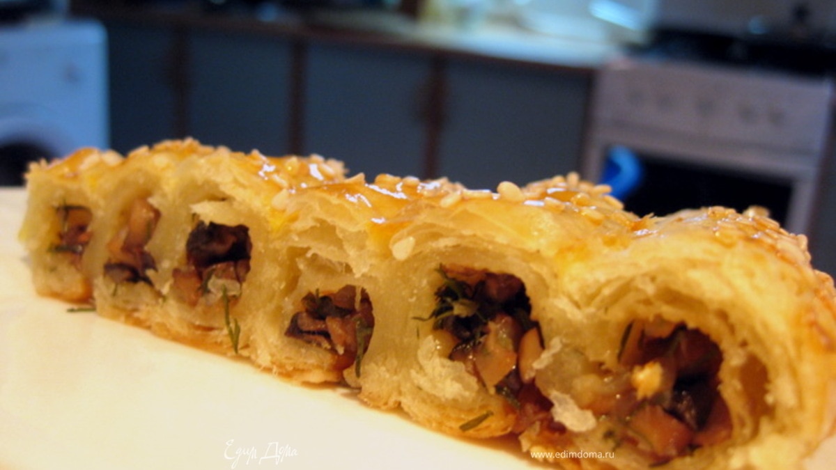 - ПодготовкаПока размораживается тесто, приготовить начинку. Для этого шампиньоны мелко нарезать кубиками и обжарить до золотистого цвета. Лук также мелко нарезать и пассеровать до прозрачности. Укроп мелко нарезать и смешать с обжаренными грибами и луком, посолить и поперчить по вкусу.