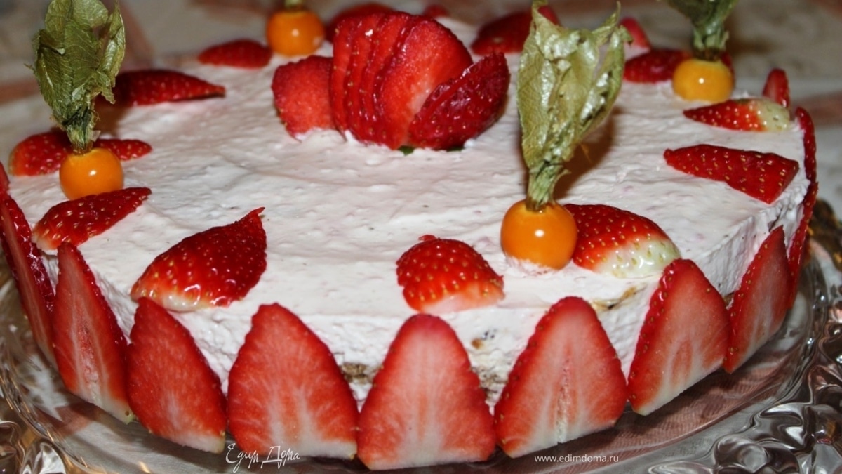 Аккуратно перенести торт на сервировочное блюдо. Для украшения клубнику лучше брать крупную. Нарезать ее пластинками и разместить их по всему периметру. Далее украсить торт по своему желанию и вкусу. - Шаг 13