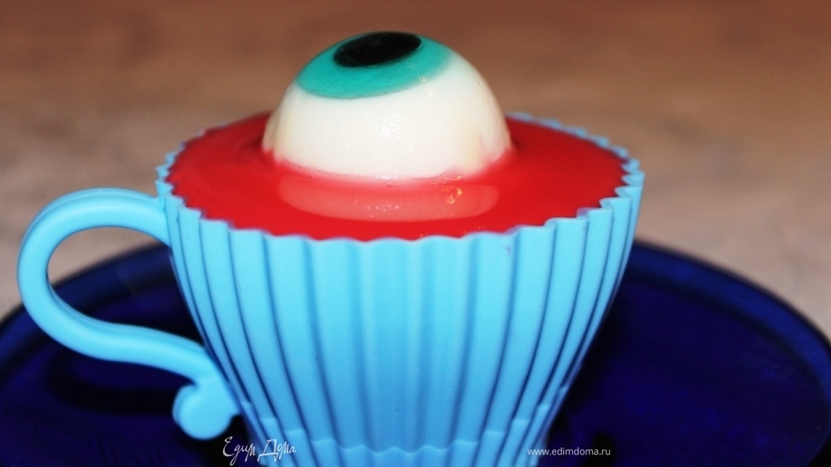 И наконец, разлить вокруг глаз верхний слой из оставшейся части клюквенной жидкости, поставить в холодильник минут на 30-60. Затем десерт можно подавать на праздничный стол. - Шаг 12