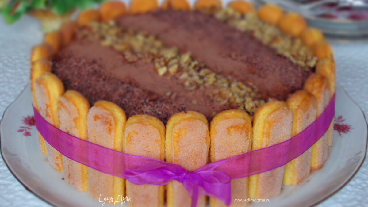 Украшение: Орехи измельчить. Шоколад натереть на крупную тёрку. Печенье Савоярди обрезать до высоты торта и украсить бока. Украсить по желанию. Поставить в холодильник на 24 часа. - Шаг 14