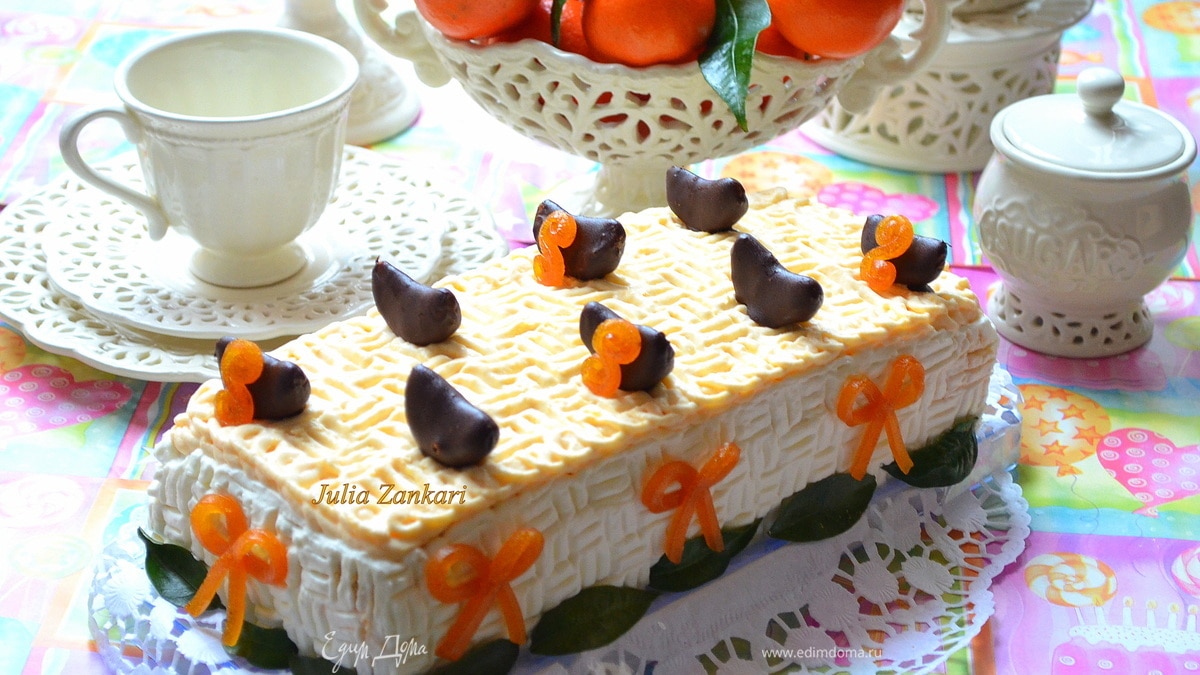 Отправляем в холодьник на ночь.Утром украшаем листиками мандаринов,мандринками в шоколаде.Я еще сделала бантики из абрикосовой пастилы.